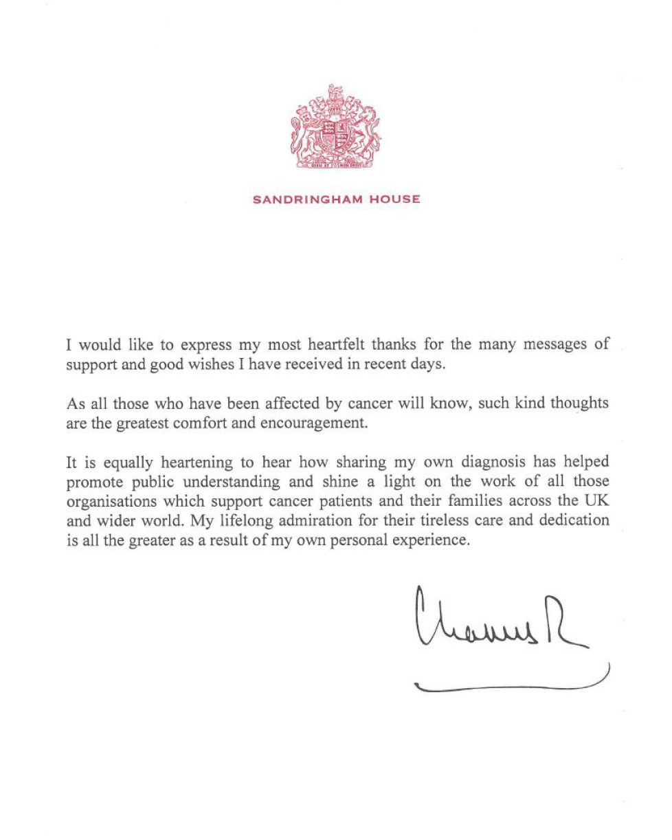 Message de remerciements du roi Charles III après le communiqué annonçant qu’il a commencé un traitement pour lutter contre le cancer.