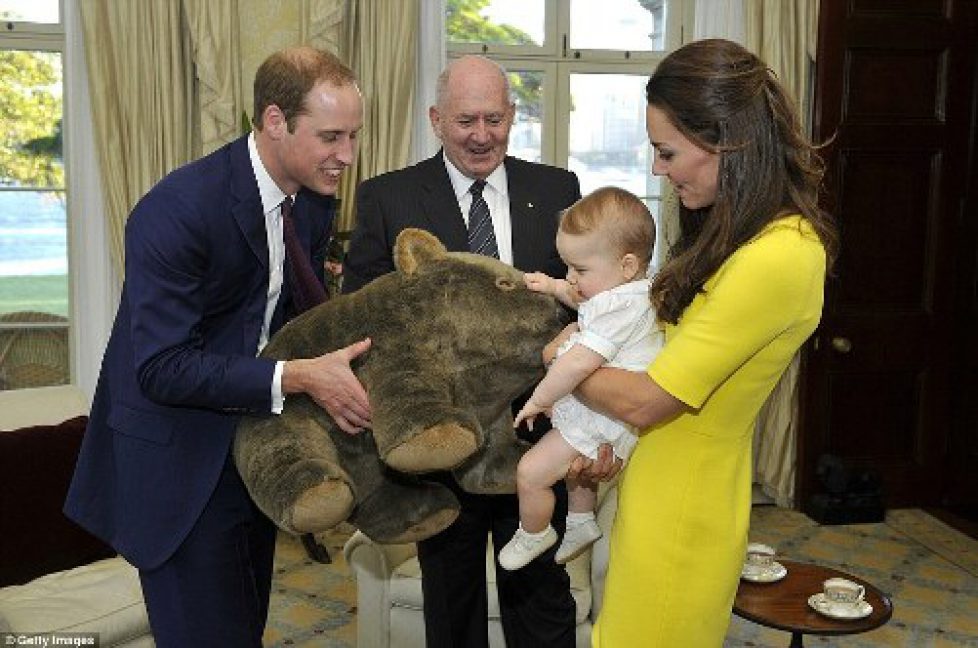 Le duc et la duchesse de Cambridge ont été reçus par le Gouverneur général d’Australie Peter Cosgrove qui remit un wombat en peluche au prince George visiblement enchanté. Lorsqu’il était petit, le prince William était surnommé par ses parents « wombat » du nom de ce marsupial. (Copyright photo : The Daily Mail)