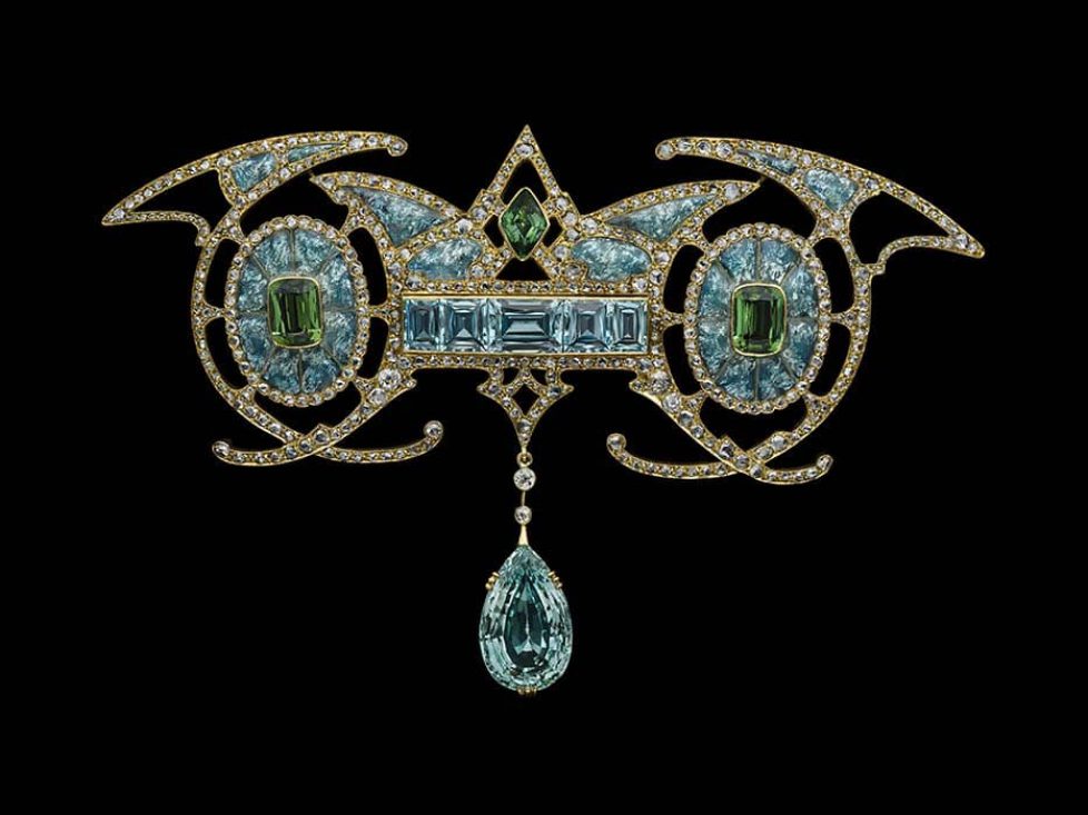 Broche créée par le joaillier français Georges Fouquet en 1901, se composant d’or, aigues-marines et tourmalines.