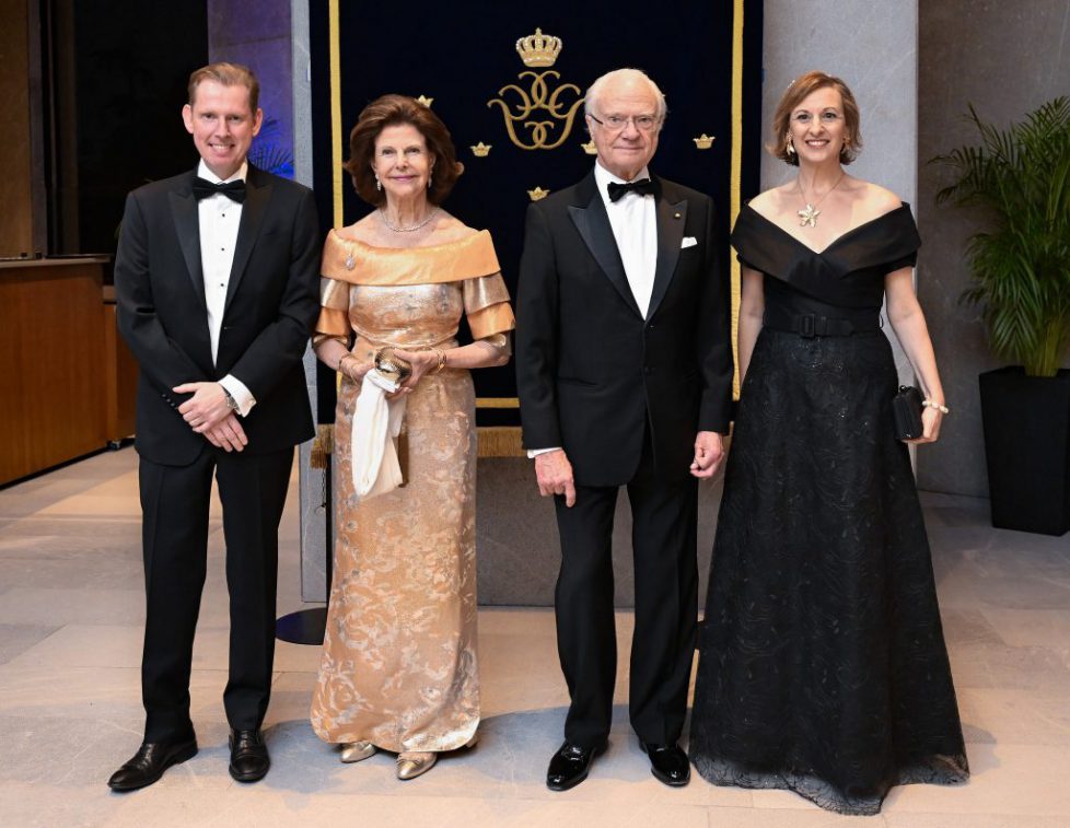 Le roi Carl Gustaf et la reine Silvia de Suède ont présidé dans un hôtel de la capitale mexicaine un dîner au premier jour de leur visite d’Etat. Ici, en compagnie de l’ambassadeur suédois Gunnar Alden et son épouse.