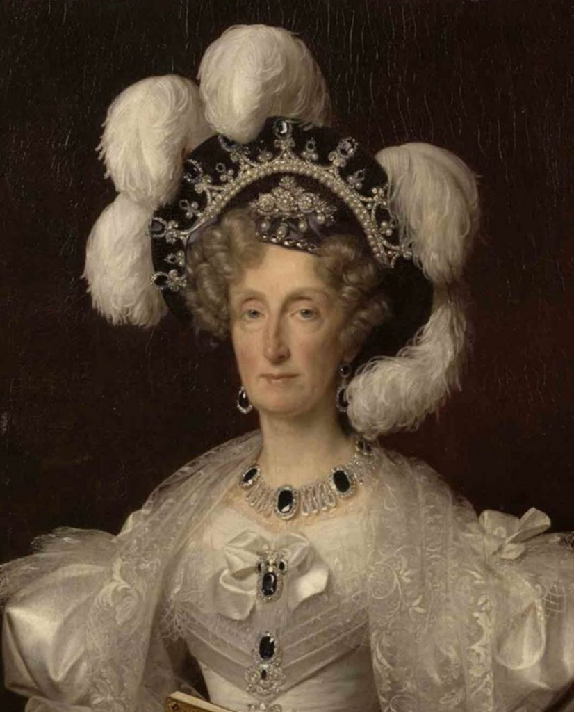 Portrait de la reine Marie-Amélie portant la parure de saphirs et diamants. On reconnaît le collier que portait la comtesse de Paris en 1973. Une boucle d’oreilles de la parure de Marie-Amélie a été également dérobée lors du récent vol du Louvre, les voleurs n’ont pas eu le temps de s’emparer de la seconde boucle d’oreilles restée sur place.