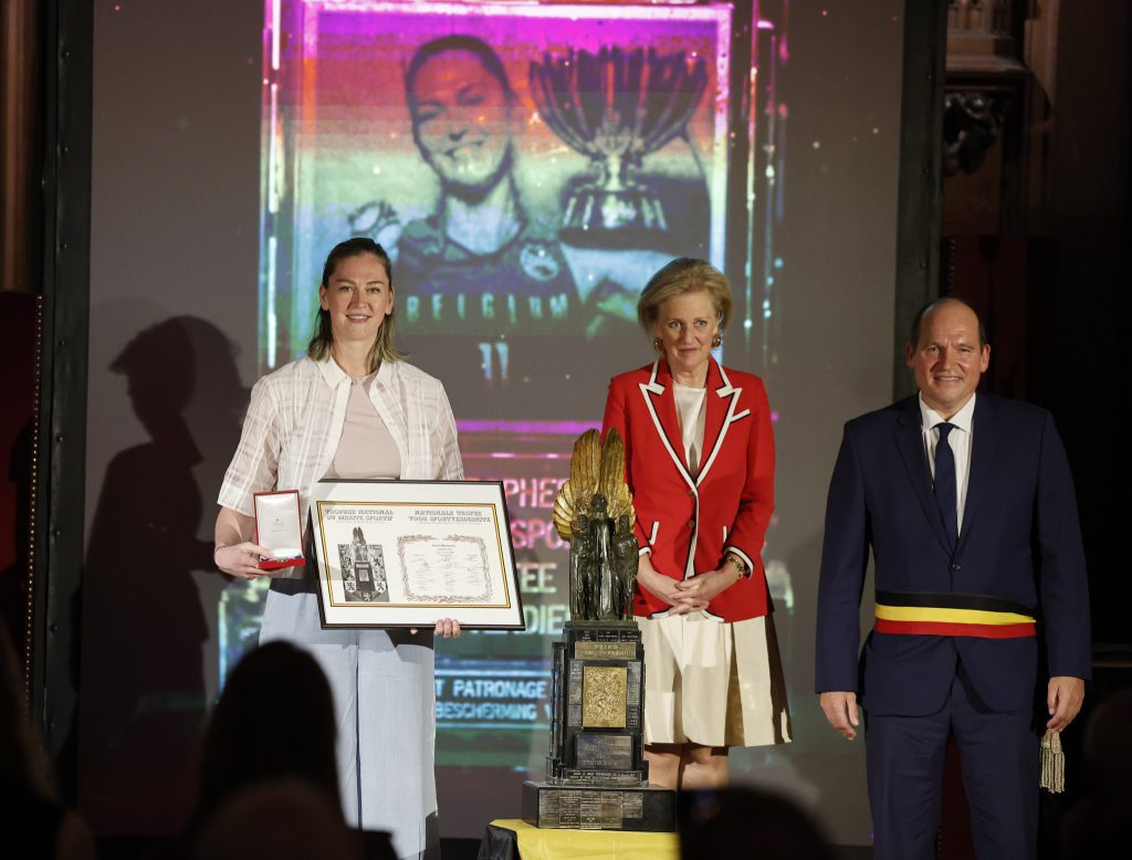 A l’Hôtel de Ville de Bruxelles, la princesse Astrid de Belgique remis le Trophée National du Mérite Sportif 2025 à Emma Meesseman, capitaine des Belgian Cats, l’équipe féminine nationale de basket. (Copyright photo : Palais royal)