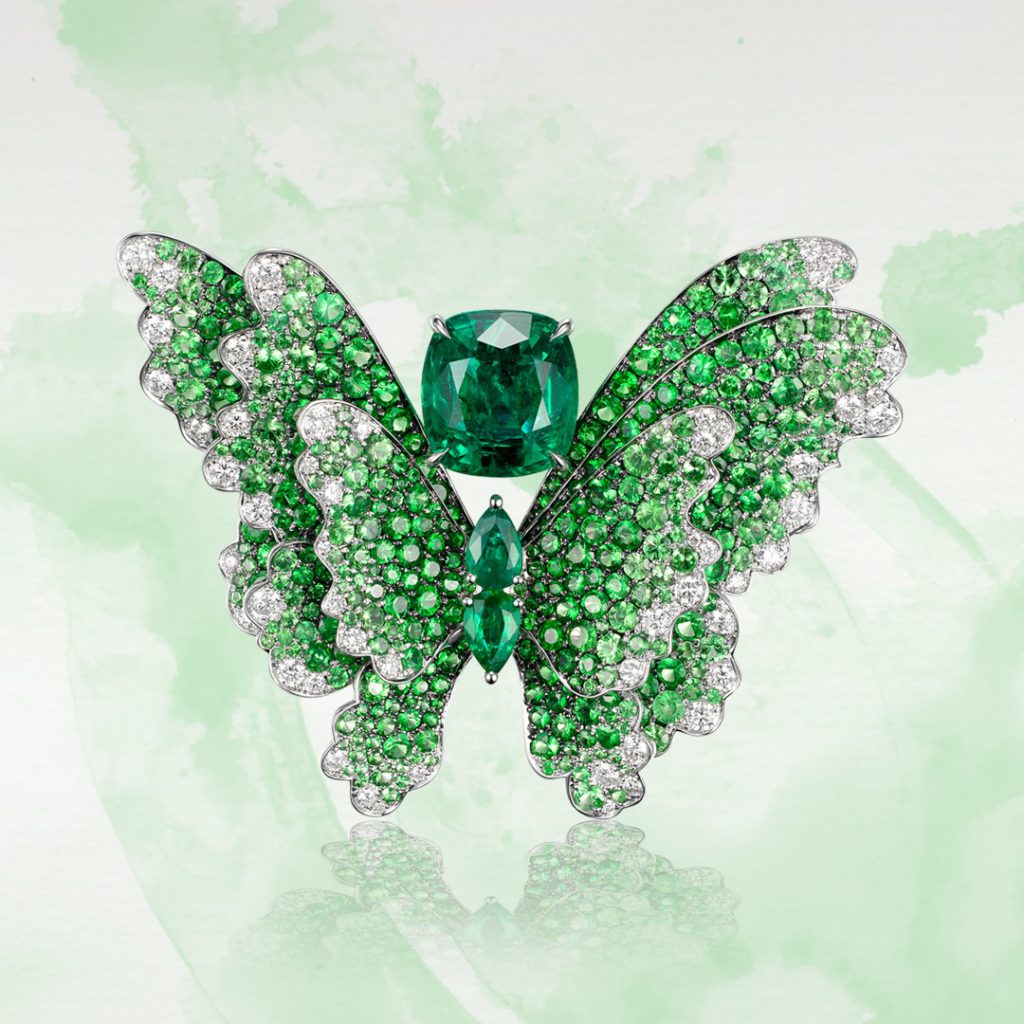Broche papillon aussi transformable en pendentif du créateur James Ganh pour le joaillier Fabergé en or blanc, émeraudes et tsavorites.