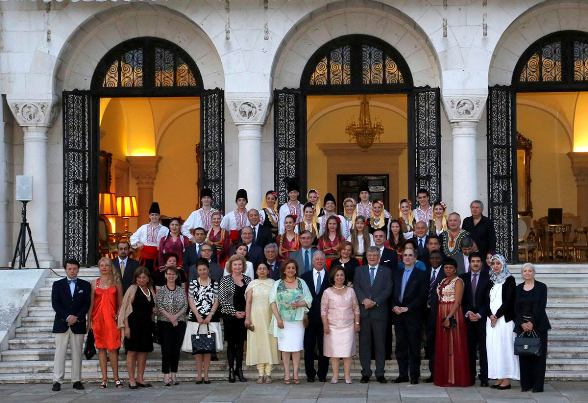 Comme le prince et la princesse de Serbie l’avaient expliqué à Noblesse et Royautés au cours de l’entretien qu’ils accordèrent en mai dernier, ils ont reçu au Palais blanc de Belgrade des diplomates en poste dans la capitale pour un buffet dîner composé de plats apportés par chacun et mettant à l’honneur les gastronomies de chaque pays. On trouvait ainsi du couscous (Algérie), du bœuf à la polenta (Croatie), du papoutsaki (aubergines farcies) (Grèce), des brochettes saté (Indonésie), viande avec légumes (Koweit), botvina (soupe) (Russie) ou encore du poulet avec de la sauce tomate (Nigéria). (Copyright photos : site de la famille royale de Serbie)