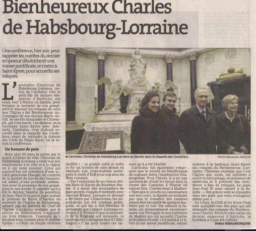 Voici un article du journal « L’Est républicain » qui revient sur la visite de l’archiduc Carl Christian de Habsbourg-Lorraine, de la princesse Marie Astrid de Luxembourg, de l’archiduc Christoph et de l’archiduchesse Adelaide en la crypte de l’église des Cordeliers à Nancy. (Copyright photo : Est républicain – Merci à Stella)