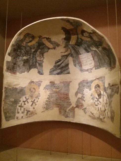 La Vierge et St Jean Baptiste aux extrémités de la coupole de l’église des Saints Georges & Nicolas à Náxos 13ème siècle.