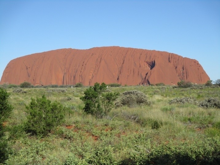 Au centre du continent, à l’extrémité orientale du grand désert de sable, se dresse le plus grand monolithe du monde, Uluru, à 348m au-dessus de la plaine environnante : il fait 3,6 km de long, 2,4 km de large, et 8 km autour de la base.