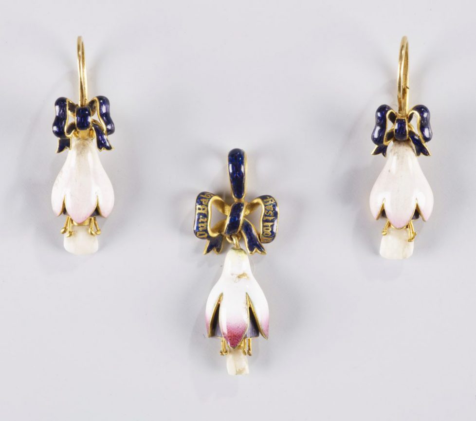 Cette parure qui représente des fleurs fuchsias (boucles d’oreilles et pendentif) comporte trois dents de lait de la princesse Beatrice, fille cadette de la reine Victoria et du prince Albert. (Copyright photo : The Royal Collection)