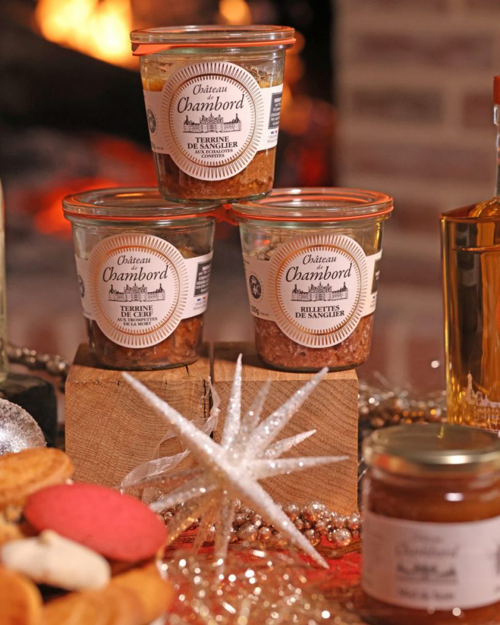 En vente au château de Chambord ou sur la boutique en ligne du château : des rillettes et terrines de cerf et sanglier, ainsi que des biscuits.