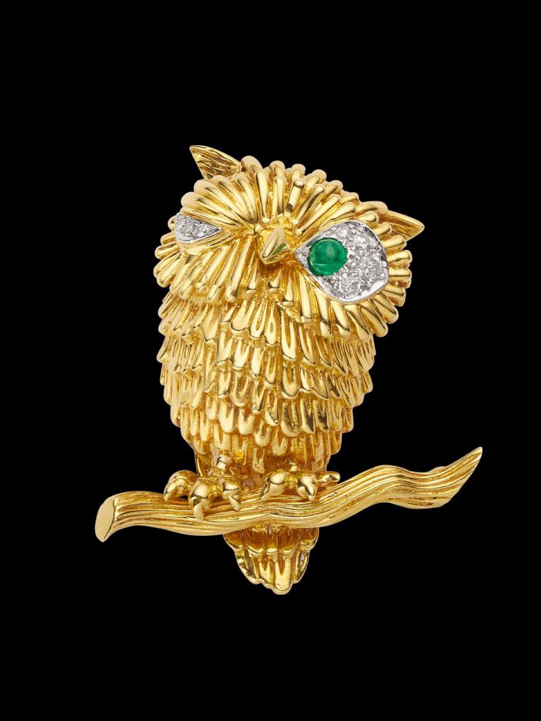 Clip « oeil de chouette » de Van Cleef & Arpels de 1970 en or, platine, diamants et émeraudes. Il sera présenté lors de la prochaine exposition « Poésie d’oiseaux » à Dubaï.