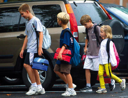 Quelle jolie famille ! Les enfants ont adopté le look américain : les tennis aux pieds et le lunch box ! Ils semblent prendre le bus scolaire, comme des écoliers « ordinaires ». N’y a-t-il pas de « gardes du corps » pour toute cette petite troupe ?