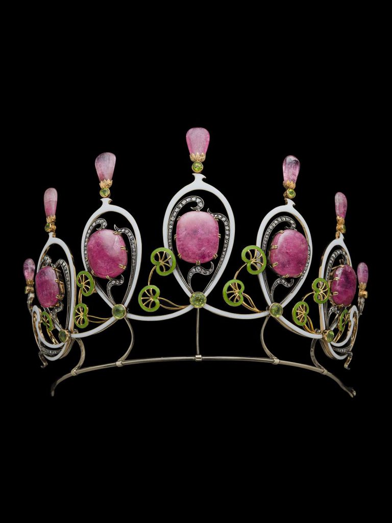 Diadème modèle Art Déco en tourmalines roses, péridots, émaux, argent, diamants et or, issu de la la collection de l’Institut d’Art Albion.