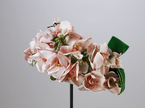 Le premier chapeau avec des fleurs de soie rose et deux feuilles de soie verte, noeud de velours de soie à été portè à Royal Ascot, 1968.