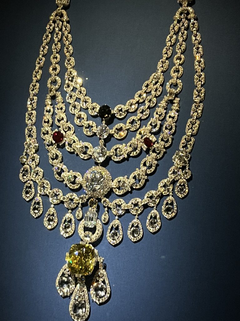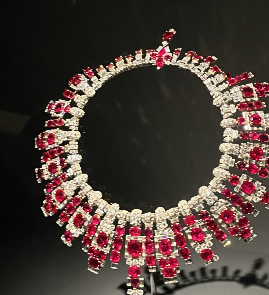 Ce majestueux collier fut commandé par la maharadja de Patiala à Cartier. Il s’agit ici d’un collier avec des pierres de synthèse.