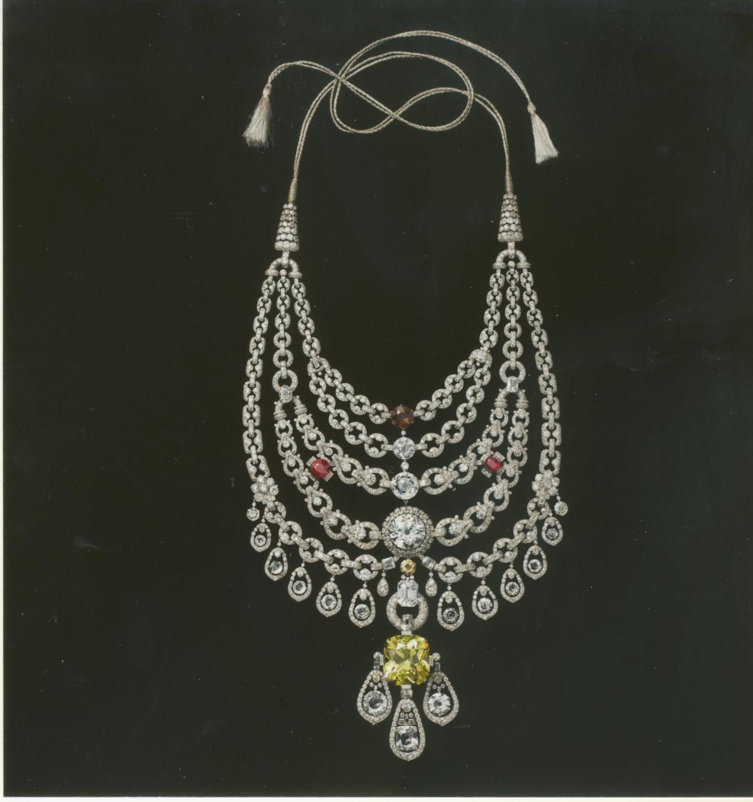 Pas moins de 230 pièces sont exposées comprenant des colliers, des bagues, des pierres précieuses, des dagues,… Parmi celles-ci, l’imposant collier ayant été créé par la maison Cartier en 1928 pour le maharadja de Patiala et restauré après avoir été retrouvé au début des années 2000. Le collier se compose de diamants, zircons, topazes, rubis synthétiques, citrine et quartz fumé, le tout monté sur platine. Il est long de 27 centimètres.