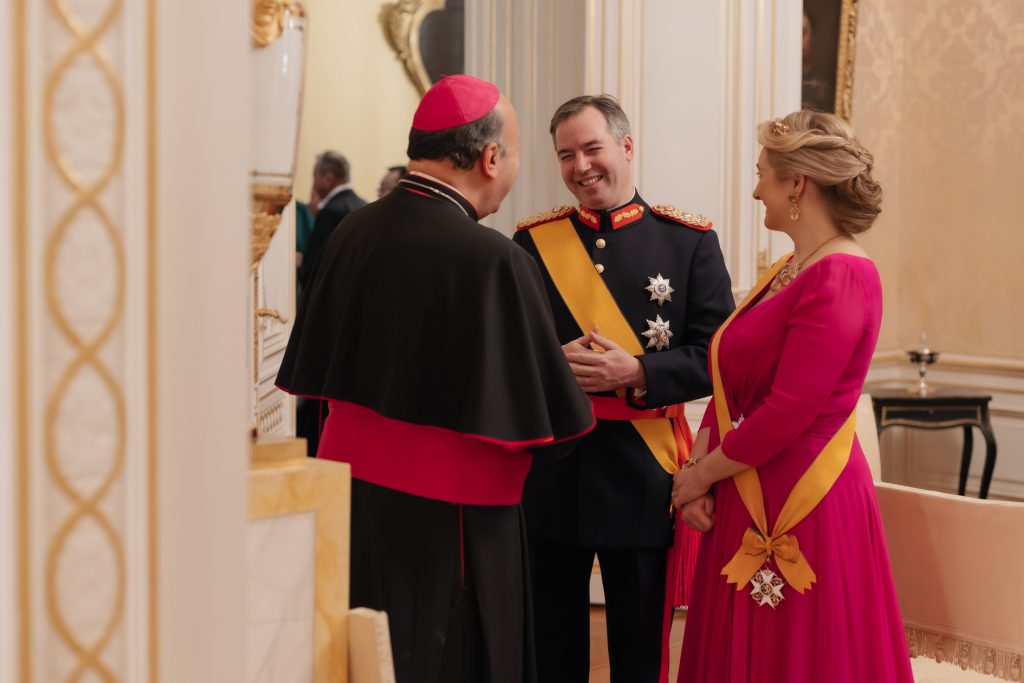 Grande réception de Nouvel An au Palais grand-ducal en présence du grand-duc Guillaume et de la grande-duchesse Stéphanie de Luxembourg portant une parure d’opales. (© @courgrandducale /Maison du Grand-Duc / Kary Barthelmey)