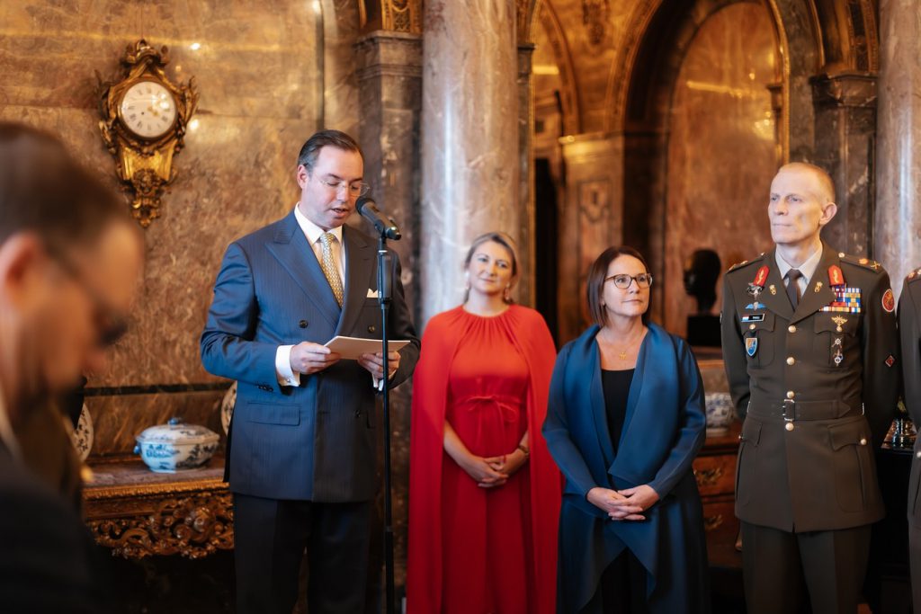 Le grand-duc Guillaume et la grande-duchesse Stéphanie de Luxembourgont donné une réception au château de Berg pour les membres de l’armée et de la police ayant participé aux opérations de maintien de la paix.(© @courgrandducale/ Maison du Grand-Duc /Kary Barthelmey)