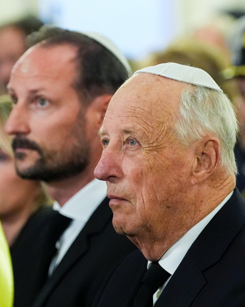A la synagogue à Oslo, le roi Harald et le prince héritier Haakon de Norvège ont commémoré les victimes du pogrom du 7 octobre 2023 qui a frappé Israël suite à l’attaque terroriste du Hamas.
