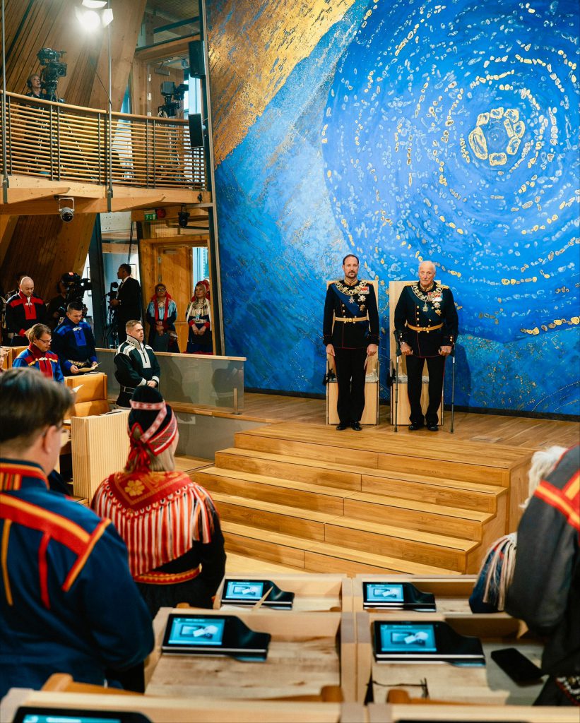 Moi aussi j’aime bien le ciel ou le rideau bleu étoilé de l’Assemblée Sami et leurs costumes bariolés. Qui sait s’il y a un sens symbolique dans la peinture bleue?