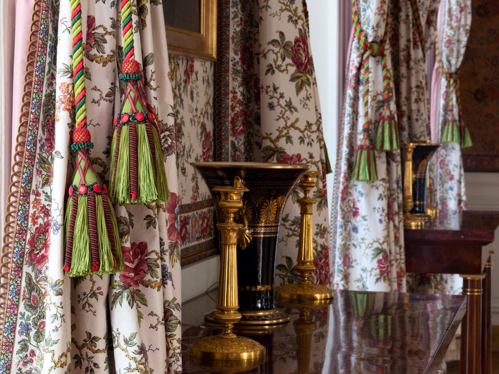 Je crois que les murs sont recouverts du même tissu que les sièges et les rideaux. C’est désuet de nos jours mais c’était très tendance à l’époque . Ce tissu de coton est très inspiré des indiennes extrêmement en vogue au XVIII éme siècle .