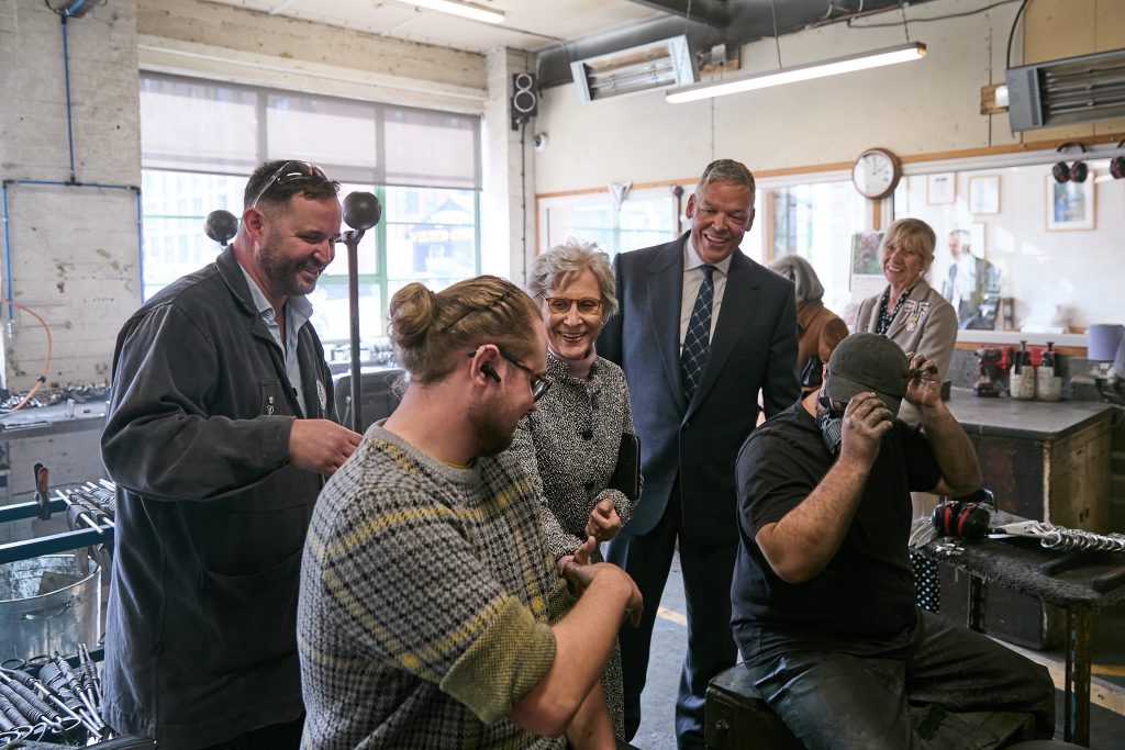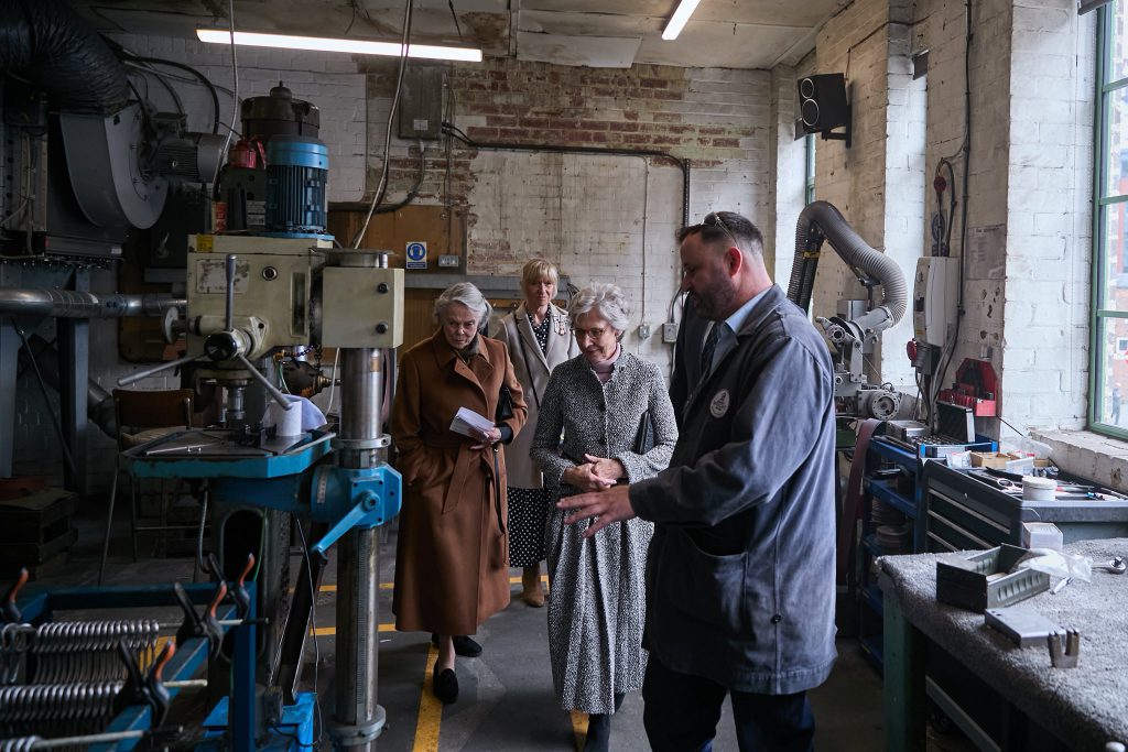 La duchesse de Gloucester continue d’encourager les métiers manuels. Ces derniers mois, elle est allée à la rencontre de charpentiers et de vanniers, et elle a demandé à deux étudiants modistes de lui réaliser des chapeaux.