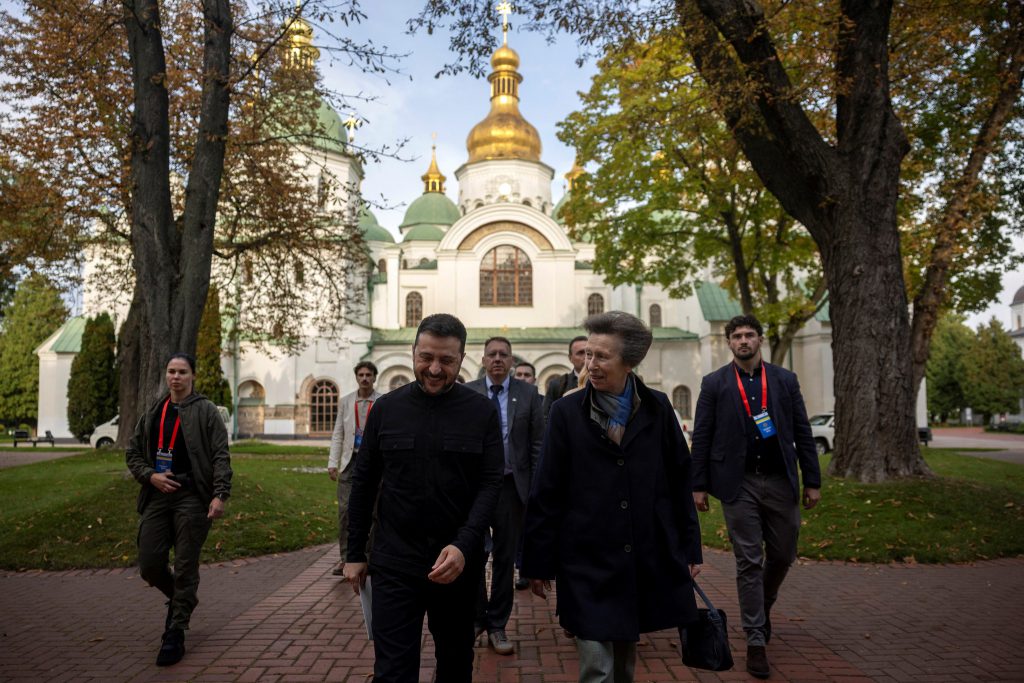 Déplacement de la princesse Anne à Kiev en Ukraine. Reçue par le président Zelensky, la princesse a visité la cathédrale Sainte Sophie avant de se rendre en compagnie d’Olena Zelenska au Mémorial des enfants morts depuis le début de la guerre.
