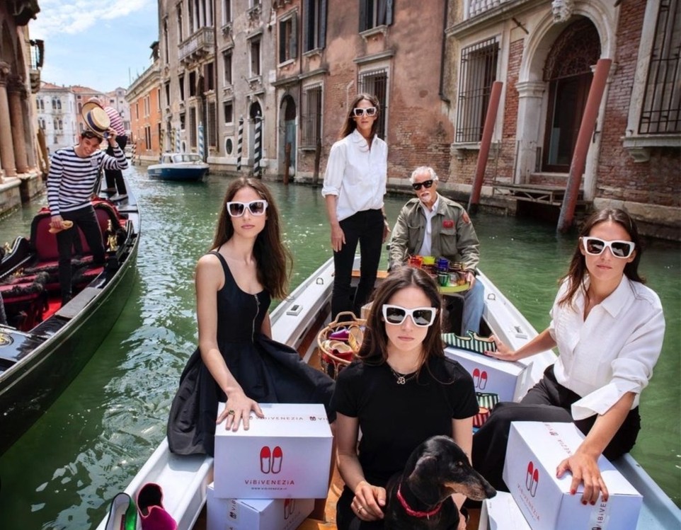 La princesse Bianca de Savoie et son époux Giberto, comte Arrivabene Valenti Gonzaga, sur les canaux de Venise en compagnie de leurs trois filles aînées Viola, Vera et Maddalena qui se consacrent à la commercialisation des pantoufles traditionnelles des gondoliers vénitiens qu’elles ont revisitées et qu’elles commercialisent sous la marque « ViBi Venezia ».