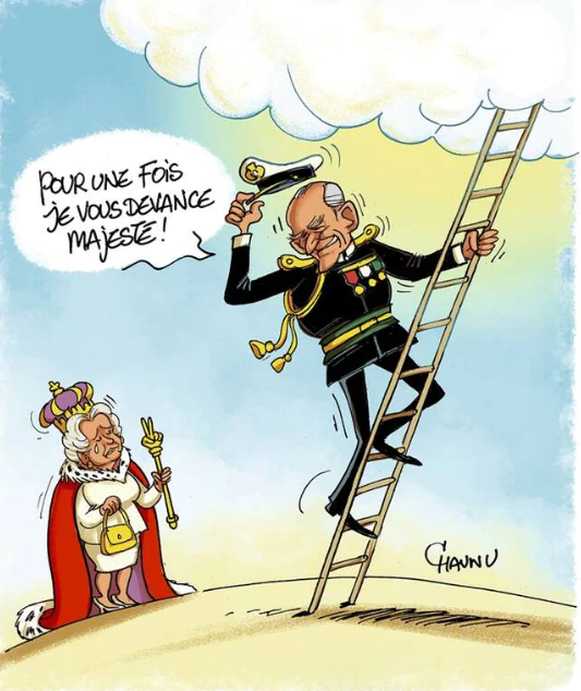 Les funérailles du duc d’Edimbourg auront lieu ce samedi 17 avril 2021 à 16 heures (heure de Paris) mais la cérémonie débutera une trentaine de minutes avant avec le cortège funèbre. Ici, une émouvante caricature de Chaunu.(merci à Guizmo)