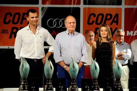 Le roi Juan Carlos accompagné par le prince et la princesse des Asturies a remis les distinctiosn aux gagnants de la Copa del Rey de voile à Palma de Majorque. Une grande absente cette année, la reine d’Espagne qui achevait un séjour familial et privé en compagnie des Infantes Elena et Cristina en Grèce. (Copyright photos : Hola)
