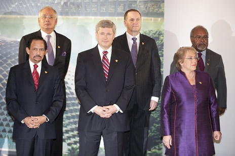 A Singapour, le sultan de Brunei a assisté au sommet de l’APEC (Asia-Pacific Economic Cooperation). Ici en conversation, avec le Premier ministre canadien Stephen Harper. (Copyright photo : Getty images)