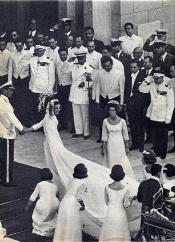Dans la Métropolite, décorée de dix mille glaïeuls rouges, avaient pris place quatre cents invités. Compte tenu de l’ascendance prestigieuse des époux- tous deux descendants de la reine Victoria– l’assemblée était aussi mondaine que familiale: outre les parents des époux, on reconnaissait le roi Gustave Adolphe de Suède, grand-père maternel d’Anne-Marie, Baudouin et Fabiola de Belgique, la reine Juliana des Pays Bas et le prince Bernhard, le roi Olav de Norvège, le roi Bhumibol et la reine Sirikit de Thaïlande, le roi Hussein de Jordanie et la princesse Mouna, le prince Rainier de Monaco, le grand duc et la grande duchesse de Luxembourg, les anciens rois d’Italie, de Roumanie, de Bulgarie….Grace de Monaco, qui allait donner naissance à la princesse Stéphanie, dût se contenter de regarder la cérémonie à la télévision depuis sa chambre d’hôtel!