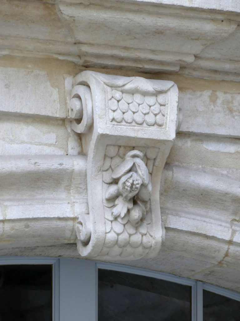 De part et d’autres, d’élégantes consoles décorées de guirlandes de feuilles, supportent l’entablement du portail.