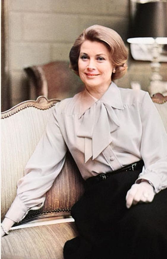 Gros plan sur les lavallières, blouses avec un noeud. Elles étaient très appréciées de la princesse Grace de Monaco et de la grande-duchesse Joséphine Charlotte de Luxembourg. La princesse de Galles les a remises au goût du jour. (Merci à Caroline VM)