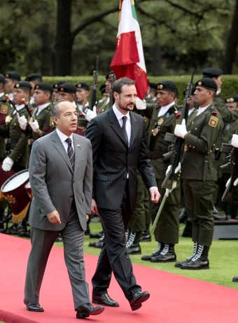 Le prince héritier Haakon et la princesse héritière Mette-Marit de Norvège ont été accueillis avec les honneurs militaires à la résidence présidentielle Los Pinos de Mexico par le président mexicain Felipe Calderon. Les princes héritiers se sont ensuite rendus au monument au Monument National au Héros de Mexico et ont visité la « Casa Azul » de Frida Kahlo. (Copyright photos : Reuters & Scanpix)