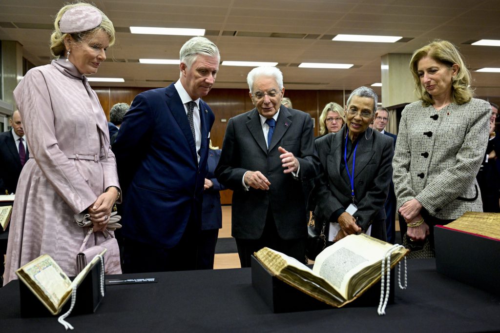 Le roi Philippe et la reine Mathilde ont fait découvrir la Bibliothèque royale à Bruxelles au président italien Mattarella et à sa fille Laura.