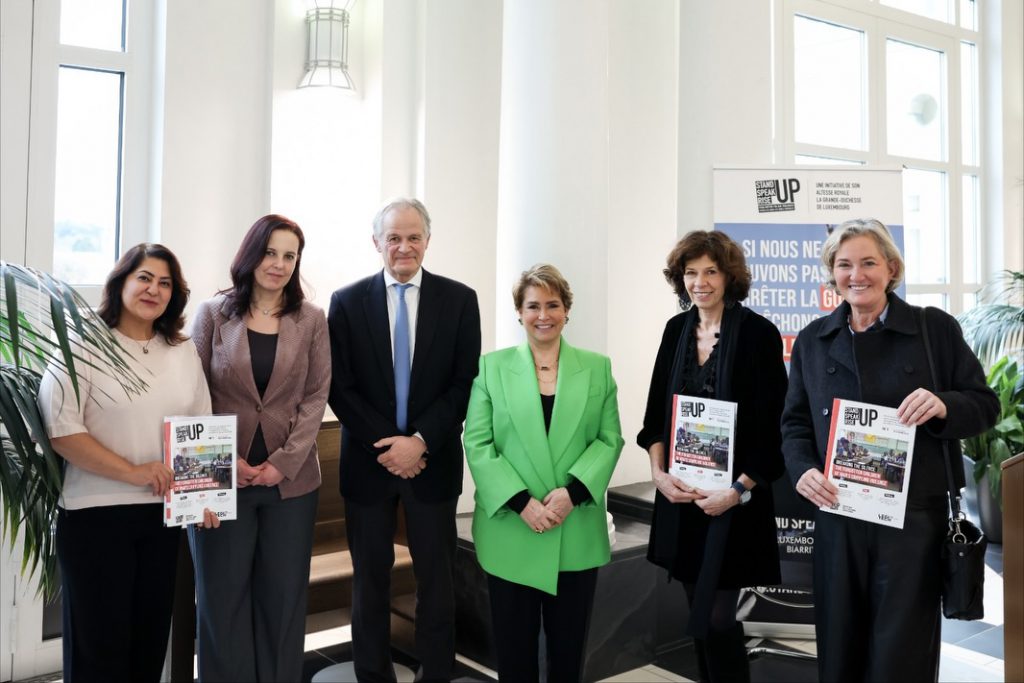La grande-duchesse Maria Teresa de Luxembourg a assisté à la Cité judiciaire à Luxembourg avec une délégation de sa fondation « Stand Speak Rise Up ! à la présentation de la revue pluridisciplinaire (première au monde) consacrée aux violences sexuelles en contexte de conflit et de postconflit.