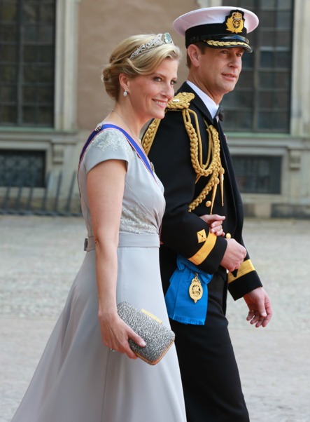 Le comte et la comtesse de Wessex sont des habitués des mariages princiers en Europe. Ce sont eux qui se déplacent en représentation de la reine Elizabeth dans ces occasions. La comtesse arborait un diadème d’aigue-marine et diamants. Contrairement à ses autres belles-soeurs la défunte princesse de Galles, la duchesse de Cornouailles et la duchesse d’York, la comtesse de Wessex ne porte pas uniquement le diadème offert par la reine à lors de son mariage mais puise régulièrement dans l’écrin royal. Au total, elel a ainsi déjà porté 4 diadèmes différents, preuve de la belle entente qui règne avec sa belle-mère. (merci à Agnès pour ses photos à Stockholm)