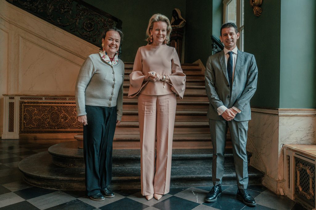 La reine Mathilde a reçu au Palais royal de Bruxelles les docteurs Martine Piccart et Evandro de Azambuja, à l’occasion des 50 ans de la Belgian Society of Medical Oncology, l’association professionnelle belge des oncologues. (Copyright photo : Palais royal)