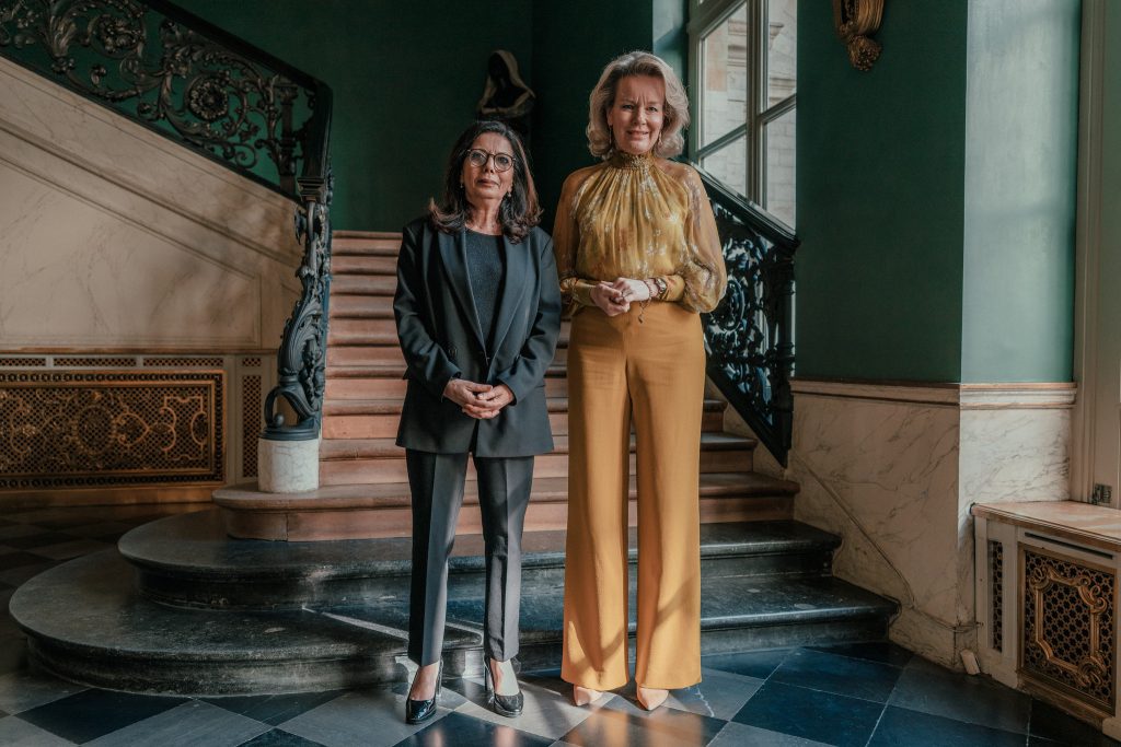 Au Palais royal de Bruxelles, la reine Mathilde en sa qualité de Défenseure des Objectifs de Développement Durable des Nations Unies, a reçu le docteur Najat Maalla M’jid, représentante spéciale du Secrétaire général des Nations-Unies, chargée de la question de la violence contre les enfants. (Copyright photo : Palais royal)