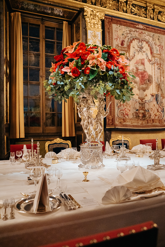 Selle royale de chevreuil, oignons grelots confits, purée de pommes de terre aux amandes parfumée au fromage affiné, coulis d’airelles et sauce au chevreuil au porto et au poivron vert