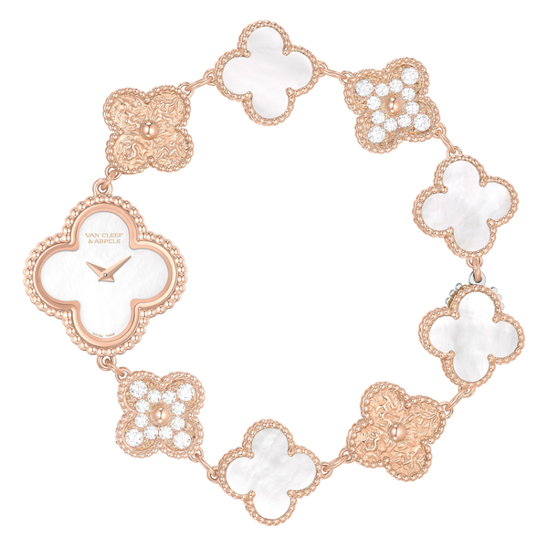 Modèle « Sweet Alhambra » en montre de Van Cleef & Arpels. Le modèle « Alhambra » se décline en collier, bracelet et boucles d’oreilles. La princesse de Hanovre et la duchesse de Cornouailles en possèdent des parures.