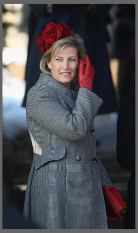 Manteau « Prince de Galles » pour la comtesse de Wessex qui portait une coiffe de grosses fleurs rouges assorties à ses gants et sa pochette