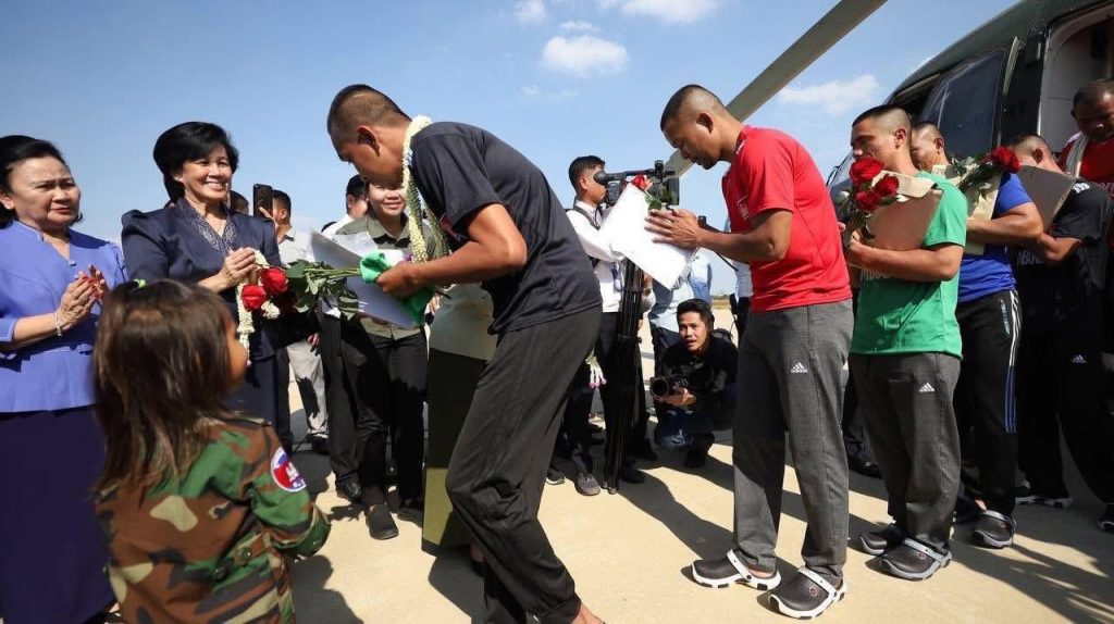 La princesse Norodom Arunrasmy du Cambodge a représenté la famille royale à l’arrivée à l’aéroport des 18 otages cambodgiens libérés par la Thaïlande. La princesse est la demi-soeur du roi Norodom Sihamoni. (Merci à Petit Belge – Copyright photos : page Facebook de la princesse Norodom Arunrasmy)