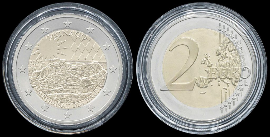 La monnaie évoquant le marquisat des Baux, fief accordé en 1642 par le roi de France Louis XIII au prince Honoré II de Monaco pour son fils Hercule, sera disponible le 4 novembre. L’avers représente une vue générale du rocher des Baux-de-Provence (Bouches-du-Rhône).