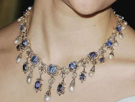 Le mois de septembre est le mois du saphir. Gros plans donc sur les saphirs portés par les reines et princesses. sur ces deux premières photos, les parures ayant appartenu à la Famille de France. (Merci à Laurent D. pour ses recherches et précisions)