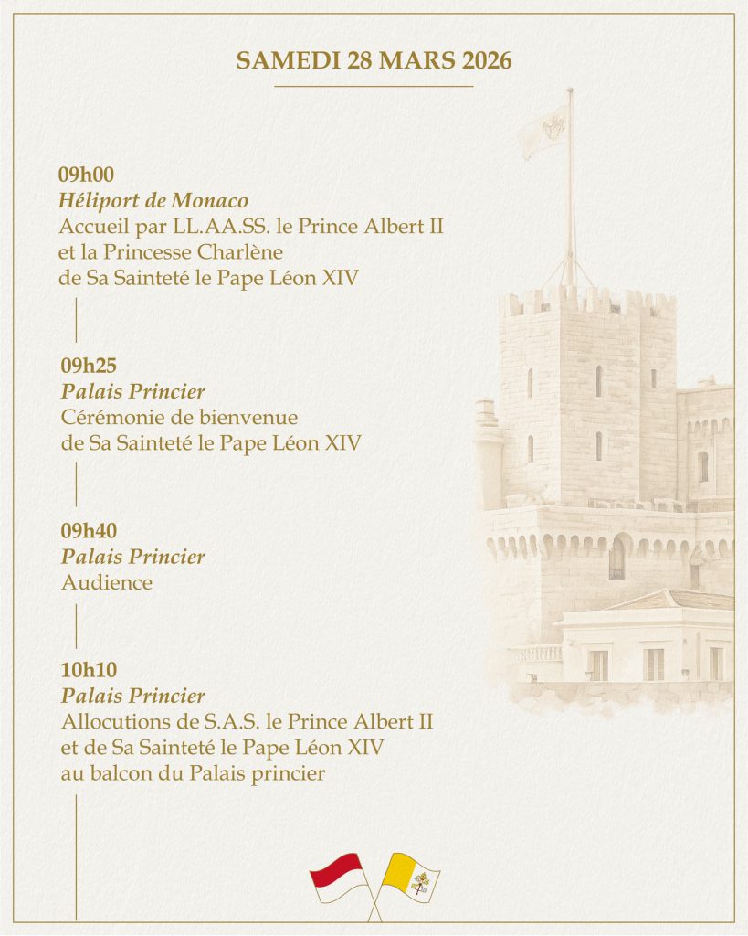 10 mars 2026 Programme de la venue du Pape en Principauté Voici le programme de la venue du Pape en Principauté de Monaco. (Merci à Bertrand Meyer) More Régine ⋅ Actualité 2026, Monaco 4 Comments Régine Salens → Régine Salens « Philippe de Belgique au centre de crise du Ministère des Affaires étrangères » La famille royale britannique à la Journée du Commonwealth 4 Comments DEB 10 mars 2026 @ 09:55 J’espère que des collations sont prévues, même si elles ne sont pas indiquées . Reply Baboula 😻 10 mars 2026 @ 10:23 Il y a même une petite sieste jusqu’à 15h30. Reply Bambou 10 mars 2026 @ 09:55 Pas de repas ? Bon en bref un petit tour et puis s’en va.. Albert ne doit plus en dormir…😂 Reply Florence de Provence 10 mars 2026 @ 10:31 Un beau programme qui doit ravir les monégasques ! Ce sera l’occasion de revoir la princesse Charlène que l’on n’a plus vu depuis les JO il me semble. Reply Laisser un commentaire Annuler la réponseVotre adresse e-mail ne sera pas publiée. Les champs obligatoires sont indiqués avec *Commentaire * Nom * E-mail * Site web Enregistrer mon nom, mon e-mail et mon site dans le navigateur pour mon prochain commentaire. Δ Ce site utilise Akismet pour réduire les indésirables. En savoir plus sur comment les données de vos commentaires sont utilisées.