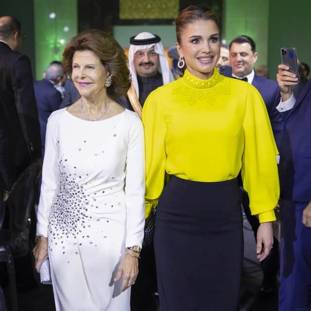 Je suis admirative de la silhouette de la reine Silvia. Quelle ligne et quelle élégance ! Rania est très bien également avec ses cheveux maintenus en queue de cheval.