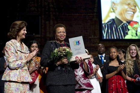 A l’hôtel de Ville de Stockholm, la reine Silvia de Suède a remis le prix « Decade Child Rights Heroes » à Graça Machel, épouse de Nelson Mandela qui le recevait en son nom et en celui de son époux qui n’avait pas fait le voyage depuis l’Afrique du Sud. (Copyright photo : Reuters)