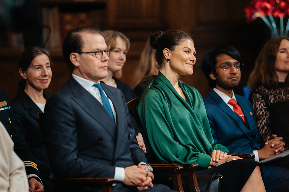 La princesse héritière Victoria et le prince Daniel de Suède ont assisté en la bibliothèque Bernadotte du Palais royal de Stockholm à une réunion de prix Nobel.